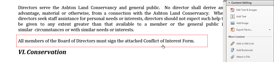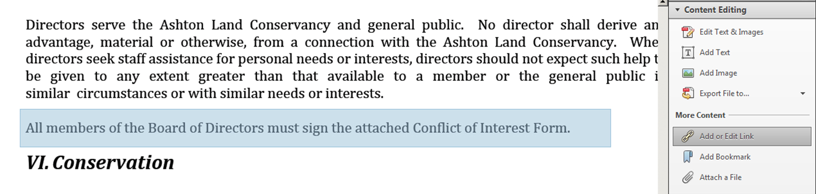 Now, that you have a file attached, you need to draw attention to it from within the PDF document. To do this, you can use either the Add or Edit Link tool or the Add Button command. I’m going to use the Link tool because I have existing text in my document that references my attachment. To start, I’ll select the Add or Edit Link tool from under the Content Editing panel and draw a rectangle around the text using the cross-hair cursor.