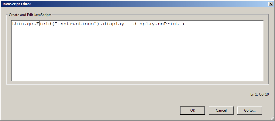 Next, I’ll open my PDF form and create a new button field and open the field Properties. In the button field properties, select “Visible but doesn’t print” from the General tab. Under the Options tab select Label only and add the word “Instructions” in the Label: area. Next under the Actions tab we’ll create two JavaScripts. First, select the Mouse Up Trigger and Run a JavaScript Action and click Add. In the JavaScript Editor dialog type the following code: