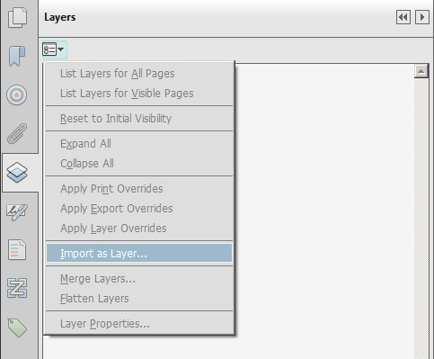 In this example, I have two separate language files – English and French. So, I’ll start by creating a new blank page (Ctrl + Shift +T on Windows or Cmd + Shift + Q on the Mac) in Acrobat. Next, I’ll open the Layers Navigation pane on the left and select Import as Layer from the Options dropdown menu.