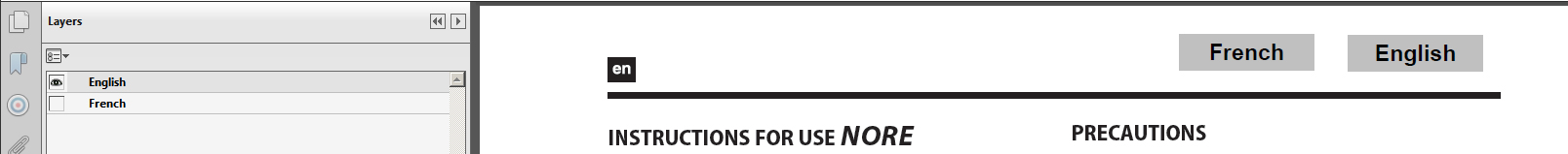 If you have several different languages, then you may want to consider using bookmarks to display the visibility of each language layer. Or, you could use a dropdown form field and JavaScript to show/hide the language layers as mentioned in this discussion on AcrobatUsers.com. You can also use JavaScript to determine the viewer’s language when opening a PDF file to display layers.