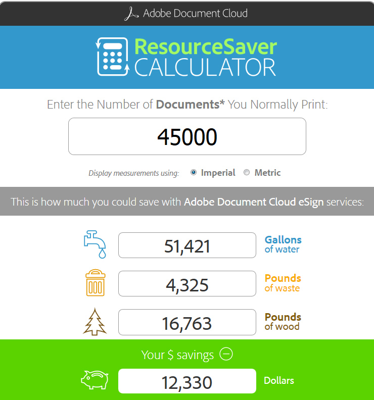 Imagine the savings to the school district if each parent filled out forms electronically.  For example, there are approximately 7,500 students in our district and each student has at least 6 paper forms to fill out and return. 6 paper forms is an extremely conservative estimate and doesn’t include permission slips, transportation forms, medication forms,  free and reduced lunch applications, or even the concussion awareness form. So, for just 6 forms, that’s 45,000 forms that are printed, filled out, and returned. Using the ResourceSaver Calculator*, this could result in over $12,000 dollars in savings, not to mention 51,421 gallons of water, 4,325 pounds of waste, and 16, 763 pounds of wood.